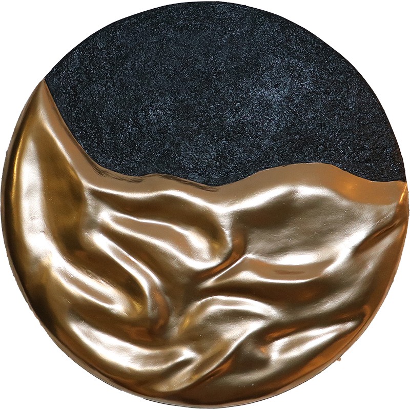 Rundes Wandpaneel, 65 cm Durchmesser. Wellenförmiges Relief mit spiegelnder Goldoberfläche und mattschwarzem Hintergrund.